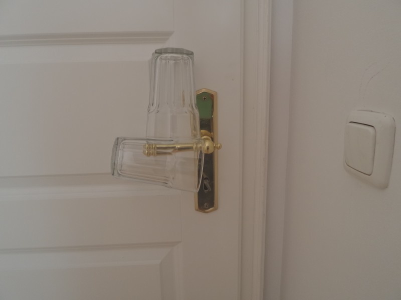 Чтобы обезопасить себя и своё имущество от непрошенного вторжения в номер ночью, бывалые путешественники используют обычные стеклянные стаканы. На ручку двери вешается один стакан, а другой ставится на него сверху. Если кто-то попытается повернуть ручку двери снаружи, стакан с грохотом падает. Постоялец проснётся, а воры, скорее всего, быстро ретируются из-за поднятого ими же шума.