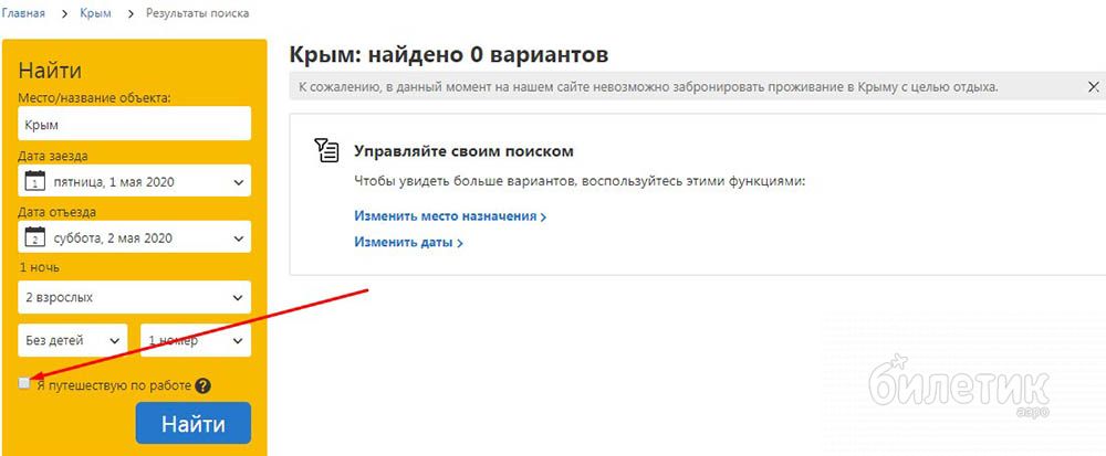 При поиске жилья на Airbnb.ru даже при выборе пункта «рабочая поездка» сервис не выдаёт никаких вариантов. А onetwotrip.com просто не показывает в поиске ни один отель полуострова, как и Agoda.com. Так что такой способ подходит не для всех сервисов.