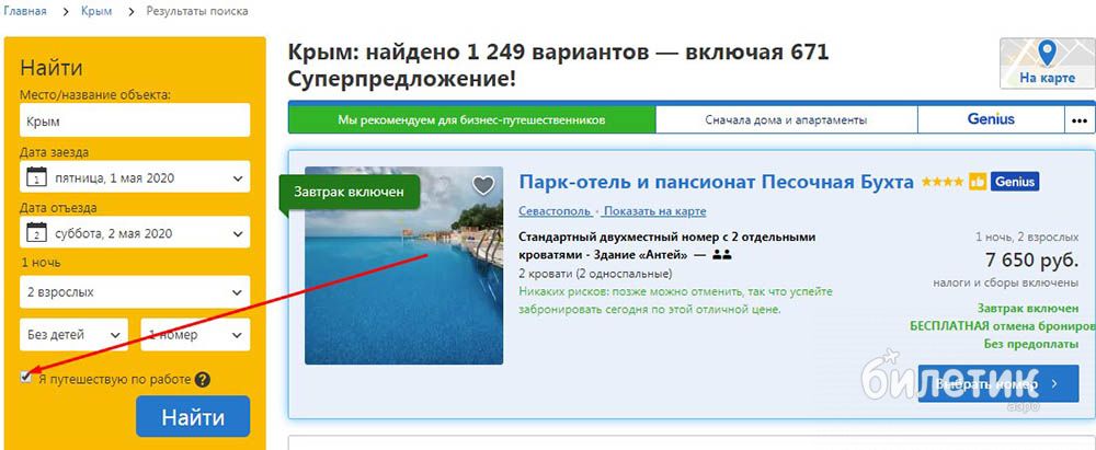 Для туриста же нет никакой разницы в том, для каких целей бронировать номер. По этому поводу с него не будут спрашивать. Booking.com только отмечает, что при выборе этой опции сервис покажет популярные удобства для бизнес-путешественников.