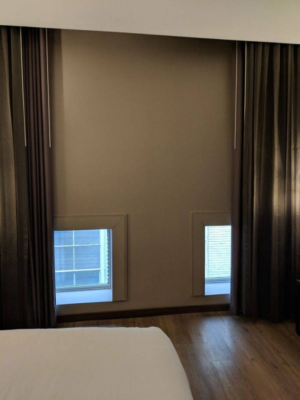 Перейдём к вещам более обыденным. Отличный вид за окнами гостиничного номера. Чтобы посмотреть в окно, придётся лечь на пол.