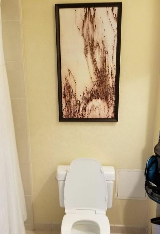 Раз уж зашла речь о санузлах, повнимательнее рассмотрите эту неординарную картину, размещённую в туалетной комнате одного из отелей.