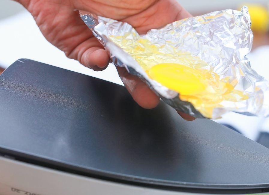 Бросьте полотенце на гладильную доску, чтобы не сжечь казенное имущество сразу. Утюг же можно использовать для приготовления еды. Однако для этого потребуется найти фольгу. Она послужит аналогом сковороды. Достаточно придать фольге форму своеобразной тарелочки, разбить в нее яйцо и поставить на нагретую сторону утюга. Таким же образом можно подогреть остывшие спагетти.