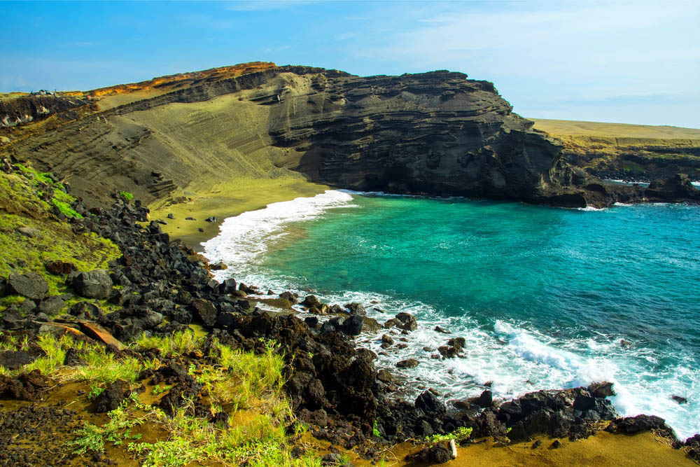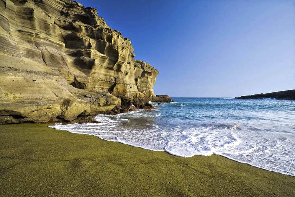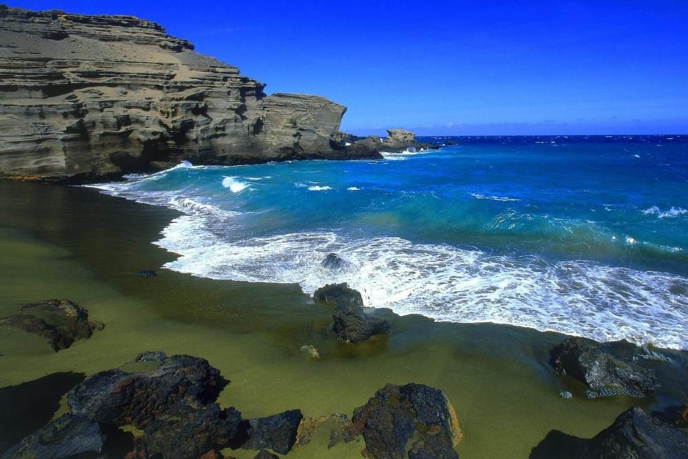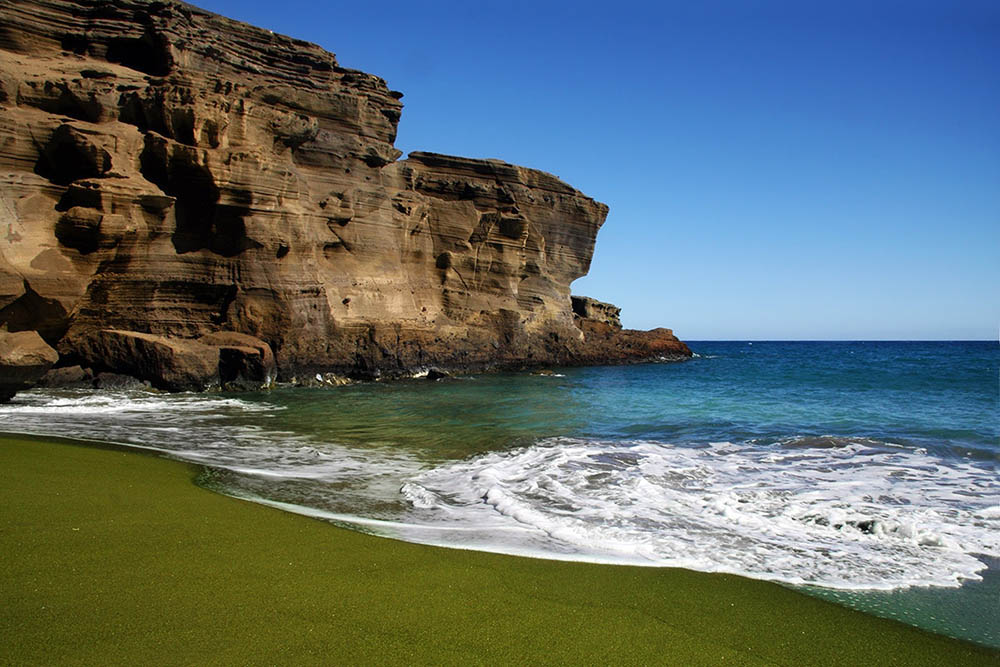 Вы когда-нибудь видели пляж с песком зелёного цвета? Такое диковинное местечко есть в США, на Гавайских островах. Зелёный пляж спрятался в полуразрушенном вулканическом кратере, он с трех сторон окружён скалами, а четвёртой стороной выходит к океану. Сюда лучше приезжать в ясные дни, когда цвет песка становится более насыщенным. В пасмурную погоду он кажется буро-золотистым или тёмно-зелёным. Утром в будние дни здесь почти не бывает туристов.