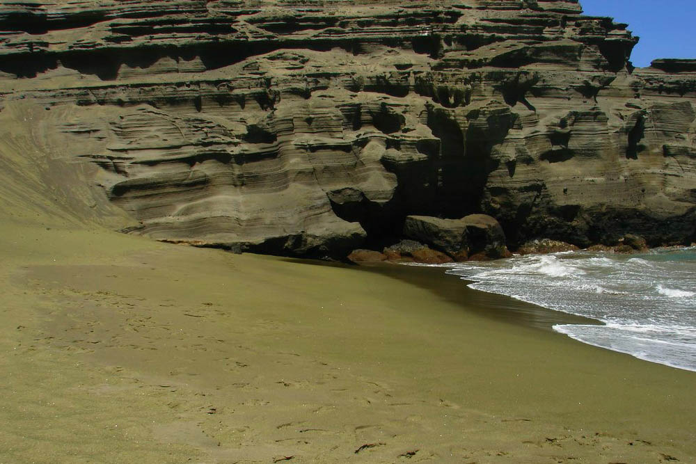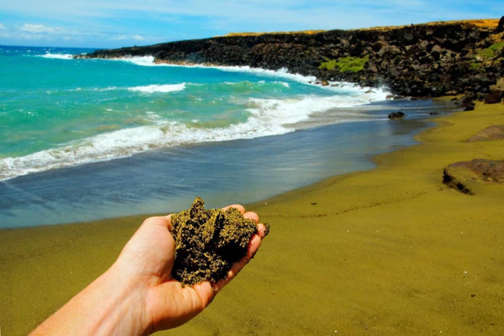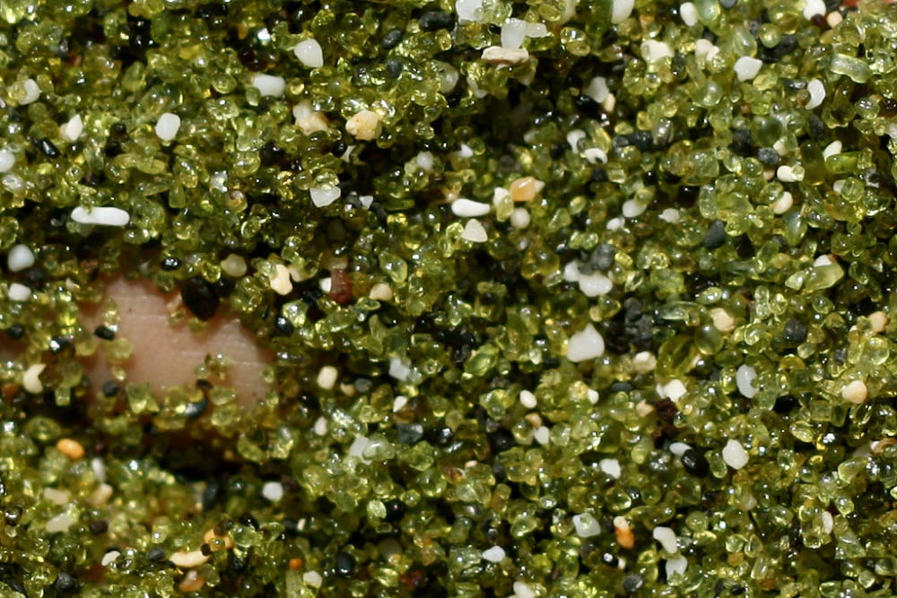 Если вам посчастливится побывать на Зелёном пляже, обязательно зачерпните песок ладонью и рассмотрите его поближе. Вы увидите, что зелёные кристаллы оливина смешаны с чёрными частицами лавы и белыми обломками кораллов. К сожалению, кристаллы оливина разлагаются под действием воды и углекислого газа, поэтому через 100-150 лет, когда в воде растворятся последние запасы минерала, пляж приобретёт обычный песочный цвет. Возможно, океан разрушит и старинный кратер, который в результате окажется на дне. Печально, но это так.