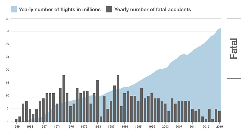 Несмотря на регулярное увеличение трафика, авиакатастрофы становятся всё более редким явлением. Для понимания тенденции необходимо рассматривать не просто число чрезвычайных ситуаций (серые столбцы), а их долю в общем количестве перелётов (голубая область на графике). Таким образом, просматривается значительное снижение числа фатальных происшествий (в которых пострадали люди) к объёму авиаперевозок.