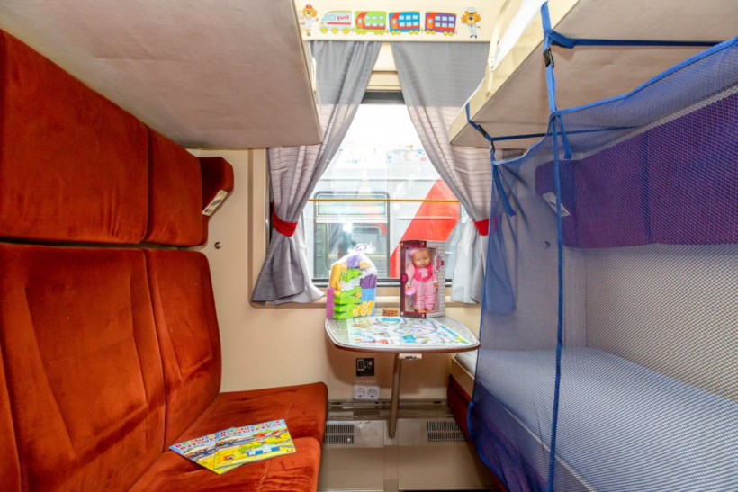 Дизайн интерьера новых купе разработан с учётом потребностей маленьких путешественников. Расположение полок стандартное, четырёхместное. Нижние диваны с удобной высокой спинкой и подголовниками обтянуты бархатистой тканью. При необходимости они трансформируются в удобные спальные места и дополняются дорожным манежем — специальной сеткой, которая натягивается вертикально между полками и создаёт для малыша приватное и безопасное пространство.