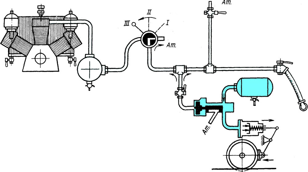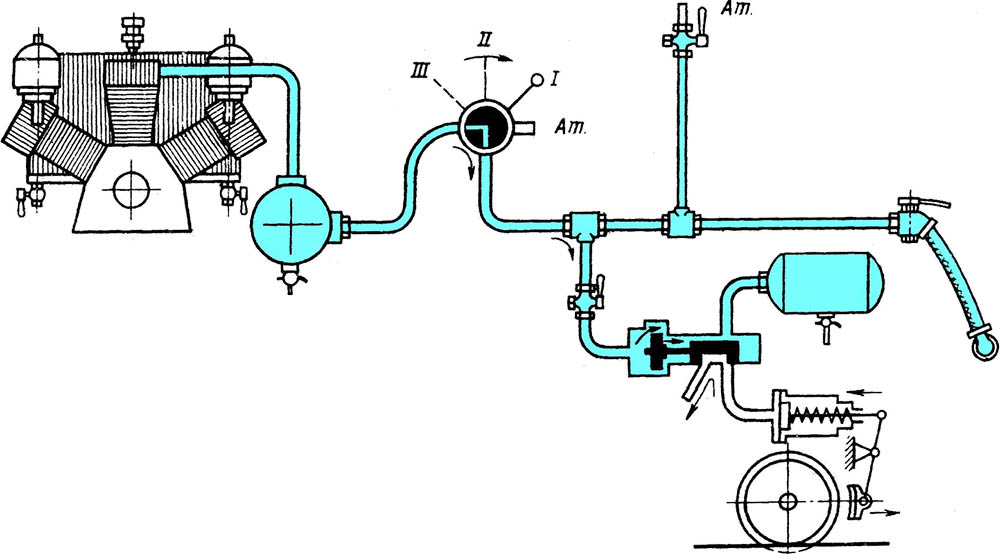Для того, чтобы остановить состав, машинист с помощью специального крана выпускает воздух из тормозной магистрали в определённом темпе. В это время воздухораспределители создают соответствующее давление в цилиндрах. Его можно увеличивать, периодически делая разрядки (изменение давления в тормозной магистрали путём выпуска порций воздуха с разной скоростью). Это будет являться ступенчатым торможением.