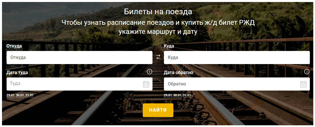 Для того чтобы начать поиск жд билетов, заполните все необходимые поля в форме поиска: