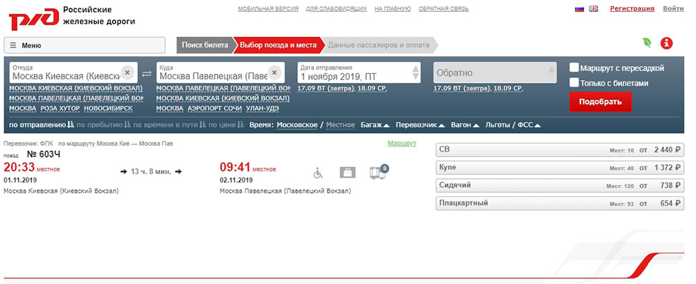 Существует и другой поезд, следующий по обратному маршруту. Он выезжает в 18:40 с Павелецкого вокзала и прибывает на Киевский в 07:55.