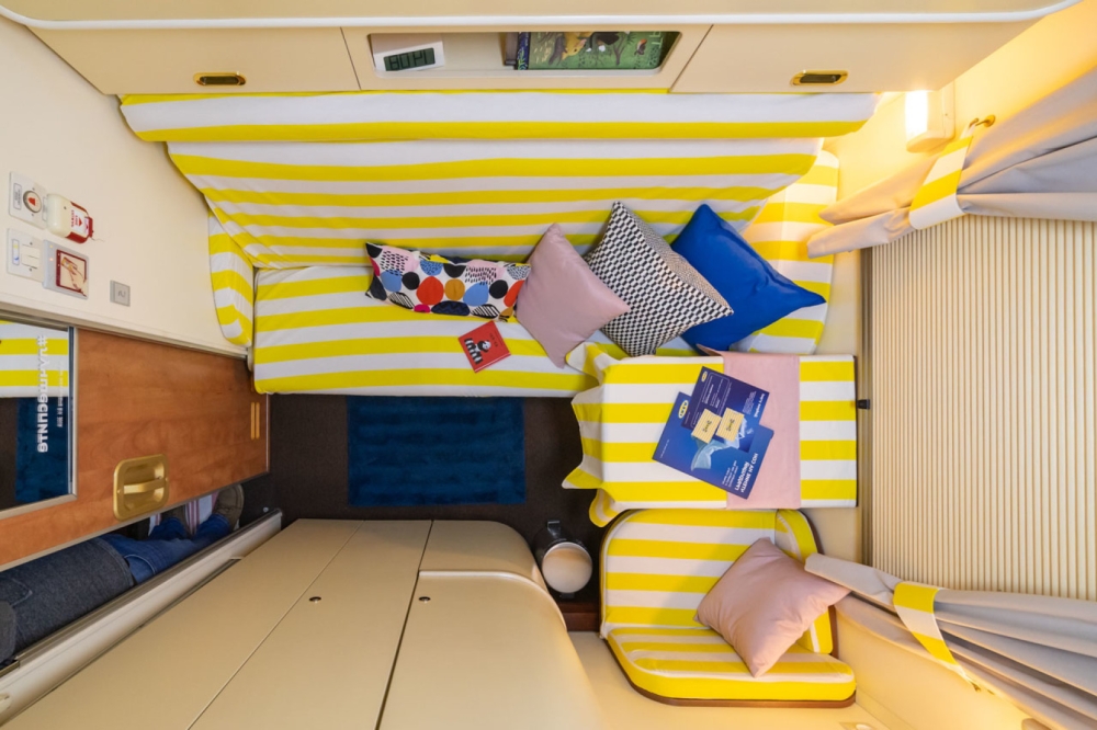 В рамках эксперимента спальные места были полностью переоборудованы: на них появились новые высокие матрасы, стильная обивка и милые диванные подушки. Под цвет обивки подобрали шторы на окнах и скатерти на столах. В шкафах для пассажиров оставили удобные тапочки, а на столиках электронные будильники. Наутро пассажиры получат фирменный завтрак от IKEA. А если порция оказалась слишком мала, можно заказать дополнительное питание.