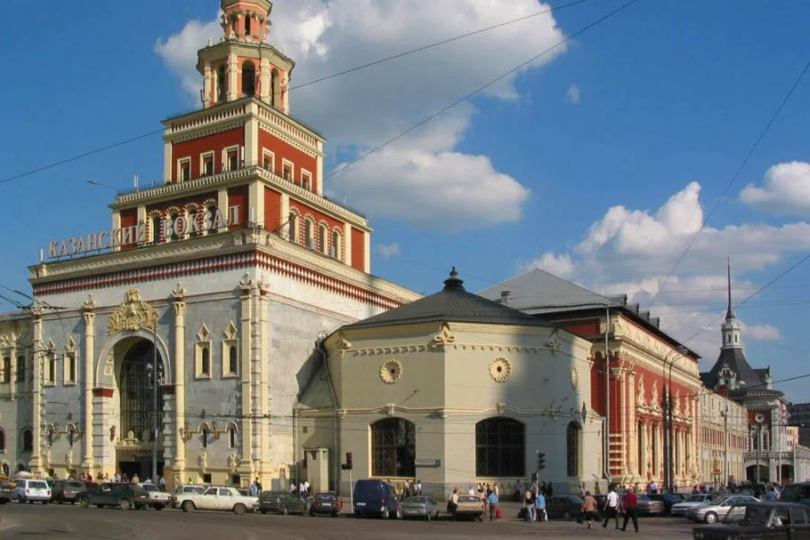 - Левая башня Казанского вокзала — копия Кутафьей башни Кремля.
