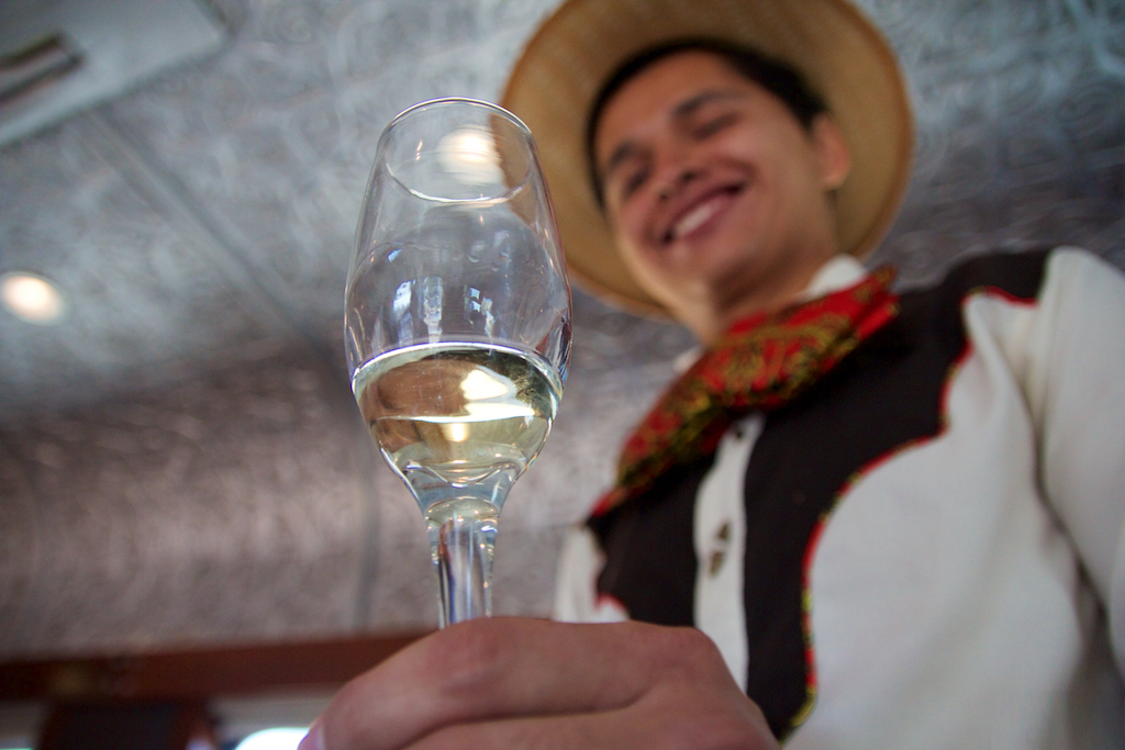 Кстати, малышей до 5 лет пускали в вагон совершенно бесплатно, при условии, что всю поездку они проведут на коленях у своих родителей. Это ограничение показалось вполне уместным, учитывая, что во время дегустации по вагонам дефилируют официанты с подносами в руках. Но после окончания дегустации, когда официанты убрали со столиков посуду, малышам всё же разрешили свободно погулять по вагону.