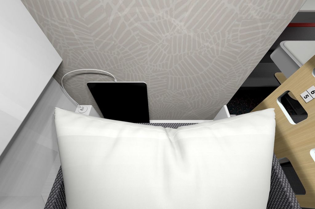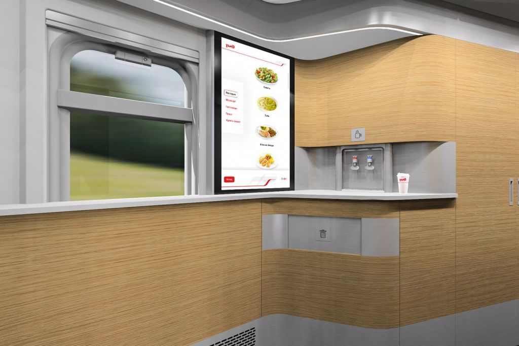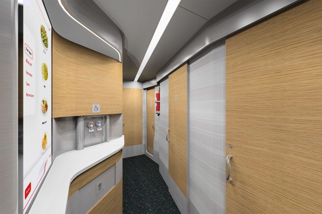 Интересным интерьерным решением является подвесной мини-столик, закреплённый между верхними полками основного отсека. Кстати, купить напитки и еду для перекуса можно будет в вендинговом автомате, установленном в вагоне.