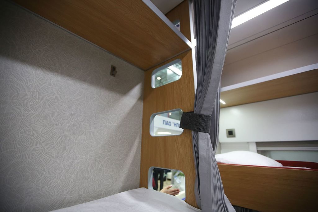 Нижние спальные места в новой интерпретации напоминают диванчики с текстильными подголовниками. Каждая полка оснащена плотными гофрированными шторками, с помощью которых пассажир может отгородиться от попутчиков и создать для себя комфортное персональное пространство. В его распоряжении окажутся: персональная розетка, яркий светильник и разъём USB для подключения гаджетов.