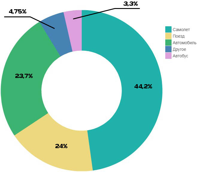 Благодаря этим мерам авиационный транспорт приобретает популярность. 44% жителей России в 2019 году выбрали самолёт. Железнодорожный транспорт уверенно занимает второе место. За этот вид транспорта проголосовало более 24% россиян. Около 23% жителей страны выбирают личный автомобиль. Таковы данные, полученные в ходе опроса на нашем сайте и страничках в соцсетях.