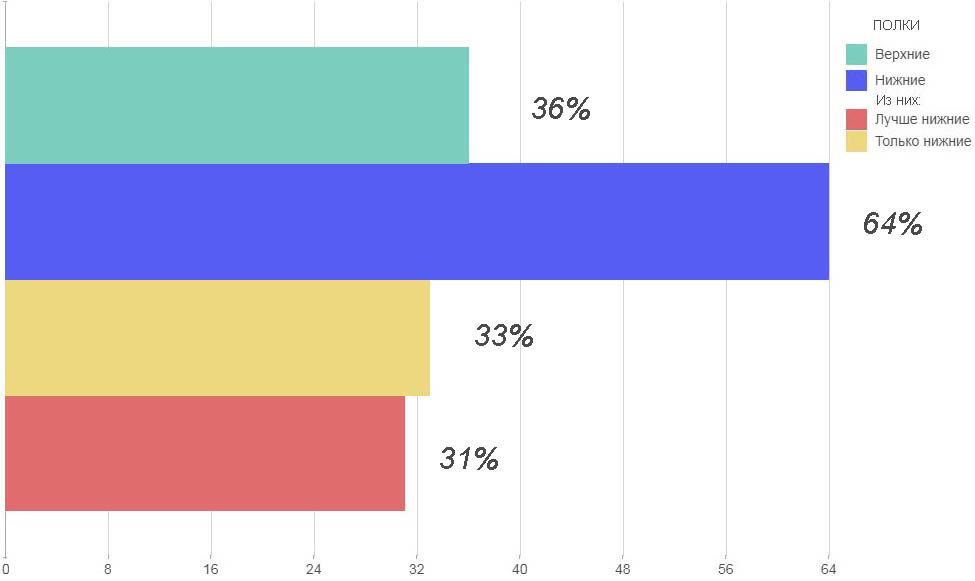 Согласно данным другого опроса, проведенного, с целью узнать, какие места в поезде предпочитают бронировать россияне. Оказалось, что большинство граждан предпочитает нижнюю полку. 64% наших читателей при выборе билетов стараются бронировать места снизу. Что интересно, 33% из них выберут другой вагон или даже поезд, но не полезут наверх. 31% опрошенных признались, что в большинстве случаев покупают билеты на нижнюю полку. Однако при отсутствии свободных мест, они готовы перетерпеть и переночевать наверху.Лишь 36% туристов любят путешествовать на верхней полке.