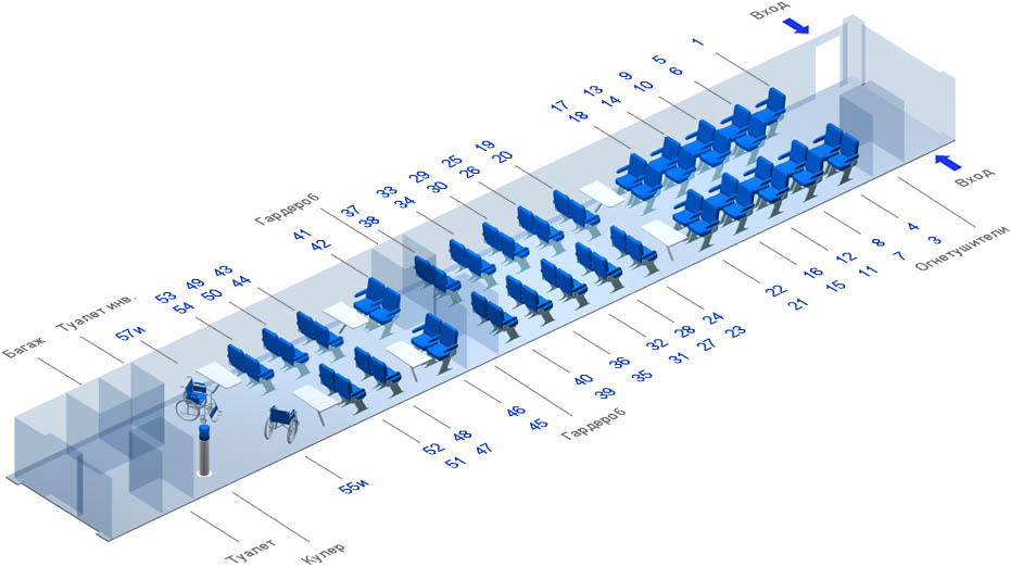 Вагон рассчитан на 71 пассажира. Места 17 — 24 и 49 — 55 расположены возле столика, поэтому здесь будет удобно разместиться пассажирам, которые хотят поработать за ноутбуком, с документами или же просто перекусить.