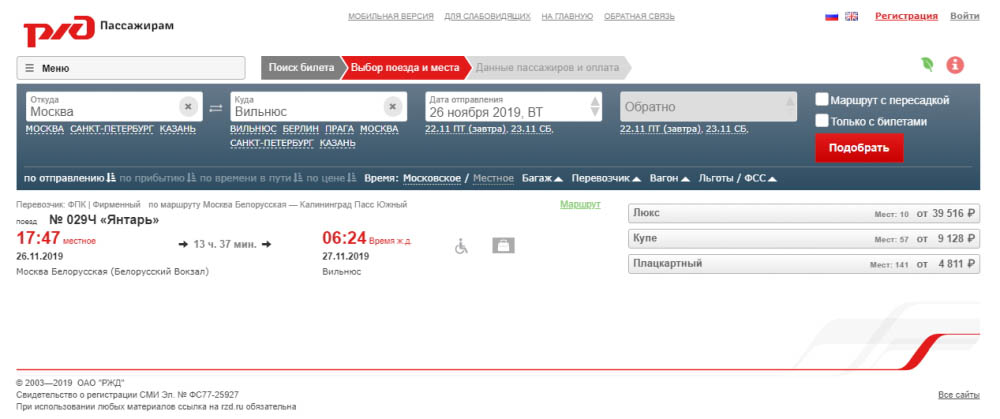 Из Москвы в Ниццу билет на поезд стоит от 167,13 евро (~ 11 820 рублей). Билет на самолёт можно найти дешевле. К тому же я посмотрела на сайте РЖД стоимость билета по этому направлению на ближайшую дату — 28 ноября. Самый дешёвый стоит от 22 400 рублей. Даже если брать билет на конец новогодних праздников, на 9 января, он обойдётся вам минимум в 20 тысяч рублей.