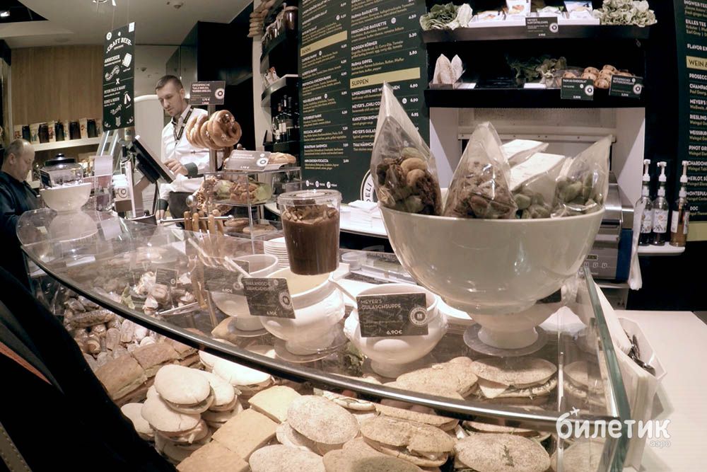 Еда. Фудкорты очень разнообразны. От уличных вагончиков с классическими брецелями (немецкий крендель) и вегетарианских лавок до серьезных ресторанов a la carte. По ценам все очень разнообразно, есть предложения для любого кошелька. Я смогла неплохо подкрепиться на 9 евро, взяв большой стакан йогурта с печеной грушей и мюсли, а также крепкий кофе.