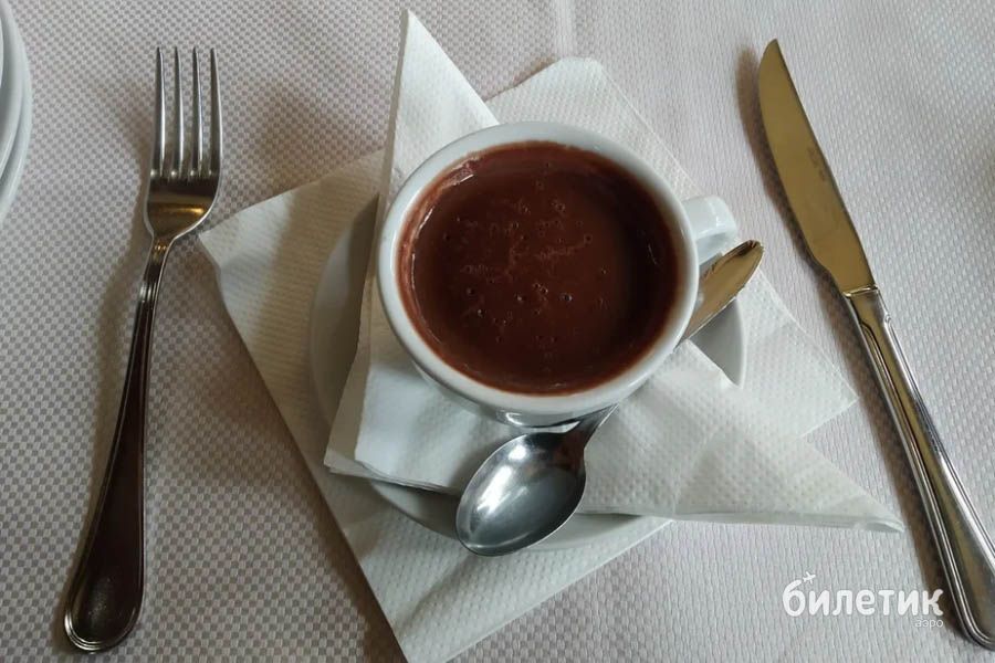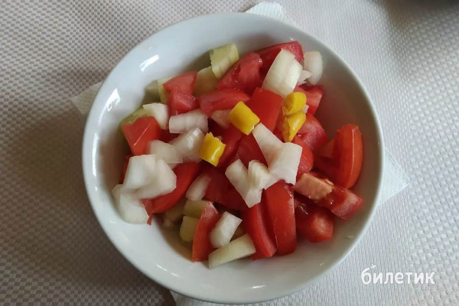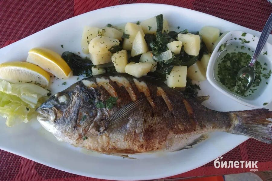 После экскурсии в Биоградском парке нас тоже привезли в ресторан, где предложили на выбор мясное ассорти или форель. Можно было заказать суп, салат, что-то из напитков. К рыбе я заказала кусочек хлеба, салат по-сербски (это помидоры, лук и острый перец), из напитков выбрала горячий шоколад.