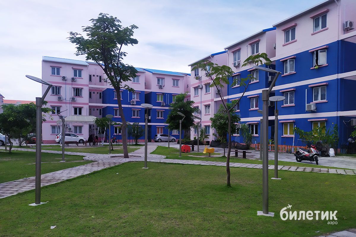 Что можно сказать... Остров Хулхумале насыпали в 2004 году, потому что развивающейся столице катастрофически не хватало земли. Ее мало, жилье стоит очень дорого, и власти построили еще один остров для увеличения полезной площади. Хулхумале — остров жилых кварталов. Там изначально продуманная планировка, кварталы малоэтажных жилых домов, дворики, улочки, скверики, широкие бульвары, супермаркеты и парковки. В общем, это — город.