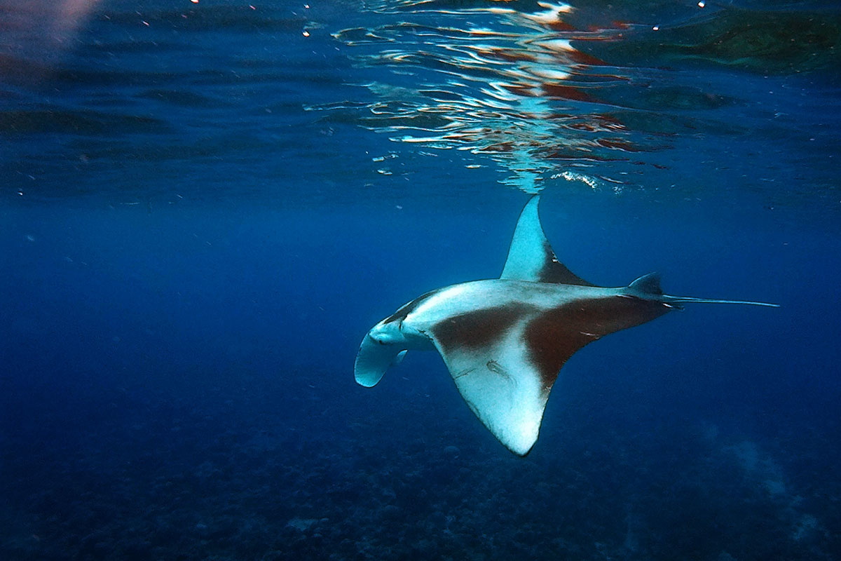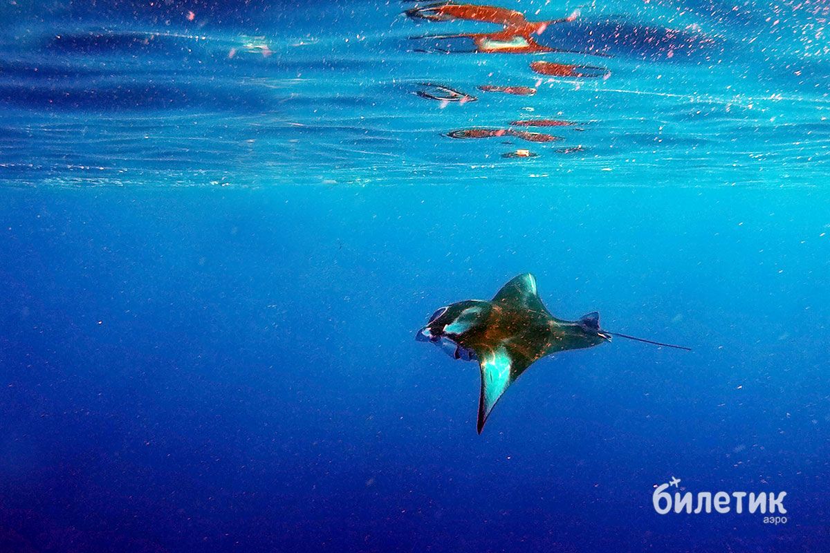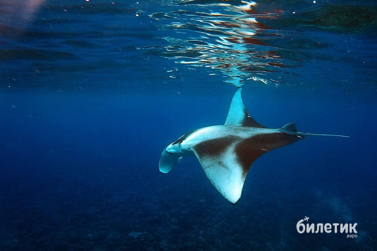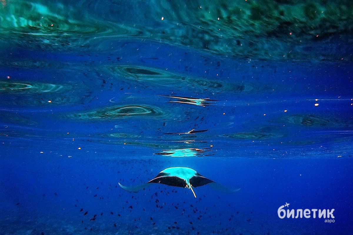 Мы попрыгали в воду. И правда, тут мант было две штуки, причем эта парочка вообще не думала убегать. Наоборот, они плавали вокруг нас словно специально — показываясь со всех сторон, подныривая и всплывая, они плыли навстречу и сворачивали буквально в метре от тебя, позировали на камеру, разевали огромные пасти и взмахивали плавниками как крыльями. Зрелище было совершенно потрясающее, ради одного этого стоило приехать на Мальдивы.