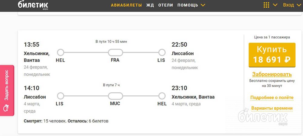На основной странице результатов запроса «Билетик Аэро», сделав за вас всю сложную работу, автоматически сформирует и предложит три категории билетов — «самый быстрый» (то есть, максимально короткое время в пути), «самый дешевый» (практически всегда содержит пересадки) и «самый дешевый и быстрый» (максимально комфортное соотношение цены и времени). Я, конечно, выбрала третью категорию и обомлела: комфортный перелет туда и обратно, совершаемый знаменитой немецкой компанией Lufthanza с одной пересадкой, по тарифу с ручной кладью до 8 кг стоил всего 11 600 рублей. Сначала я подумала, что это ошибка или где-то подвох. На свой страх и риск нажала кнопку «Забронировать» и поняла: подвоха нет, эти билеты реально столько стоят. Причем, вылетаю я в 14.00 из Хельсинки, лечу меньше, чем 3 часа, прилетаю к обеду во Франкфурт, пережидаю всего 5 часов и лечу в Лиссабон еще 3 часа. На месте буду к 23.00. За один день, меньше, чем за 6000 рублей — это очень здорово. Обратный билет тоже неплох: в 6 утра из Лиссабона, к завтраку в Мюнхене, 9 часов в славном немецком городе (моя шенгенская виза позволит выйти в город), и к 23 часам в Хельсинки — за те же небольшие деньги.