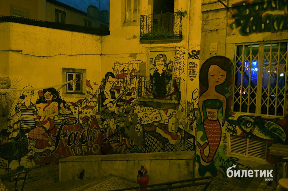 Старый город тоже украшен, в одном из дворов развернулась стрит-арт картина, посвященная знаменитому португальскому романсу — фаду. Трогательно, традиционно и очень красиво.