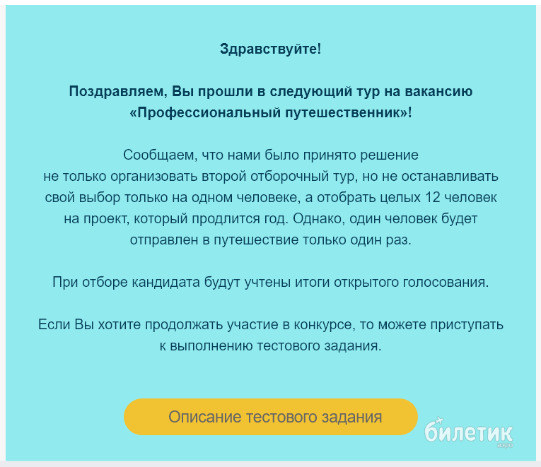 Для участия требовалось просто заполнить анкету из нескольких вопросов. Критерии отбора были неясны, но анкета была простенькая, так что я заполнил, отправил... и забыл об этом. Поэтому когда через некоторое время мне пришло письмо о том, что я прошёл во второй этап отбора, очень удивился. Надо же, это не просто рекламный трюк, оно работает!