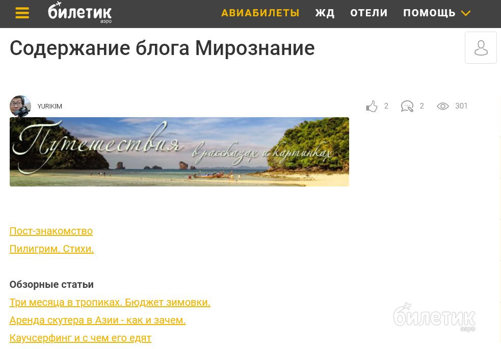 На втором этапе нужно было создать на сайте Билетика собственный блог и постить туда рассказы о своих путешествиях. И вот тут я понял, что все только начинается: подобные письма пришли совсем не только мне, а еще как минимум полутора тысячам человек. Сначала я думал плюнуть и забыть, но потом понял, что, опять же, ничего сложного от меня не требуется: надо всего лишь брать иногда кусок текста с фотографиями со своего сайта и размещать в свежесозданном блоге.А я и так этим регулярно занимаюсь, мои рассказы висят на многих туристических ресурсах, так что будет просто плюс еще один.