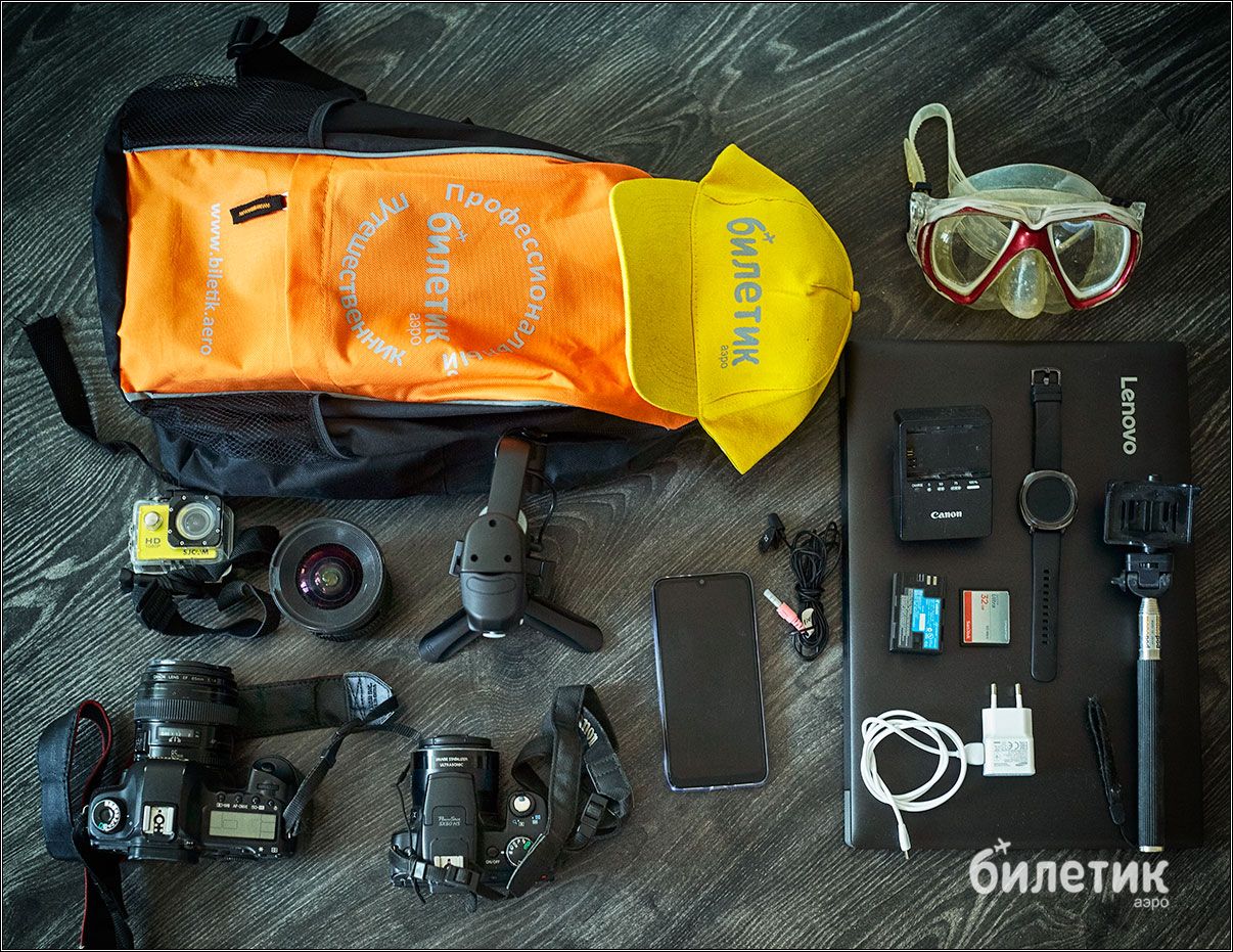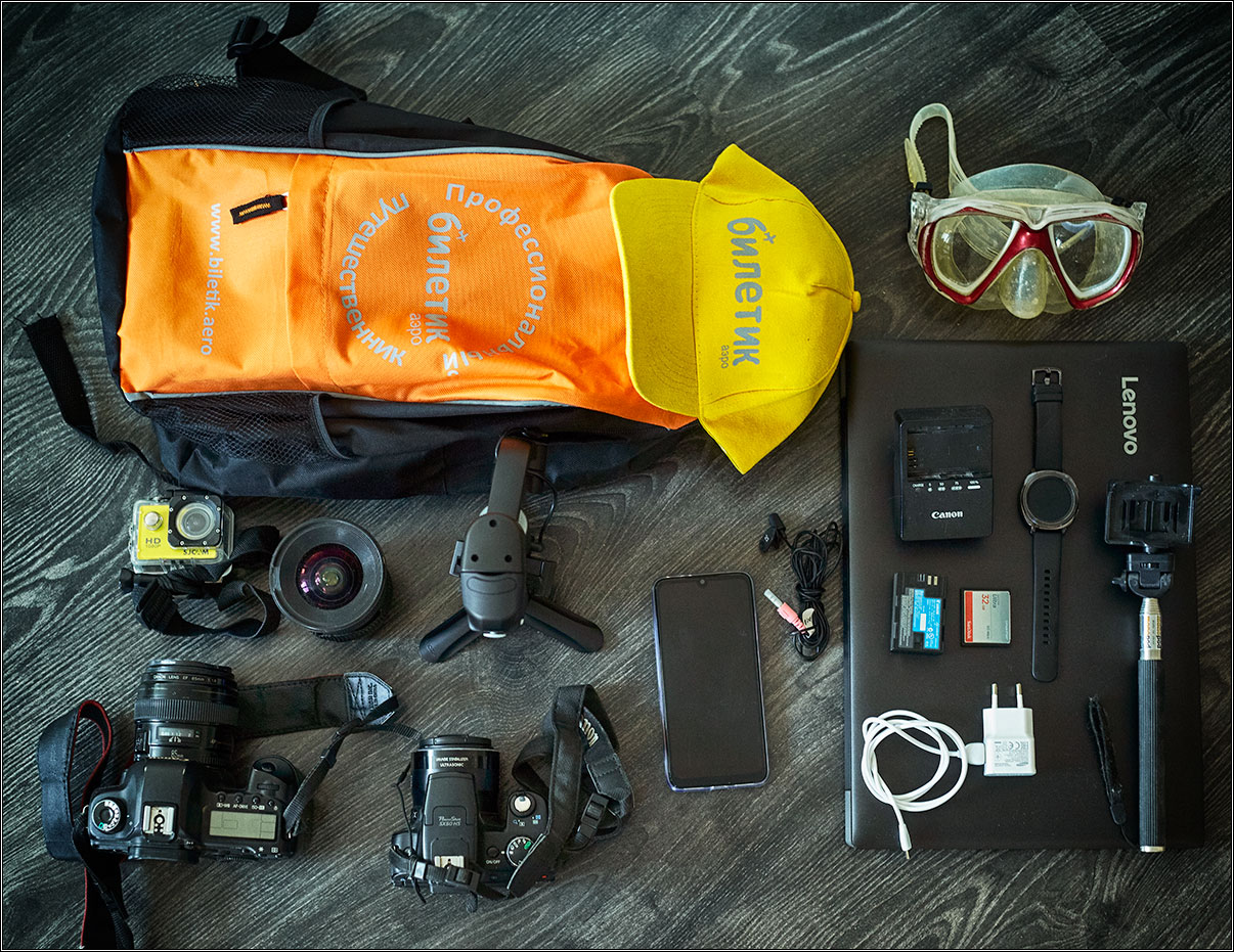 В итоге, большую часть багажа занимает техника, без которой теперь никуда. Ноутбук, фотоаппарат, объективы к фотоаппарату, штатив, зарядки трех-четырех видов, экшн-камера, обвес к экшн-камере, резервный жесткий диск, флэшки, чехлы, запасные аккумуляторы — весь этот магазин электроники и весит изрядно, и места занимает порядочно.