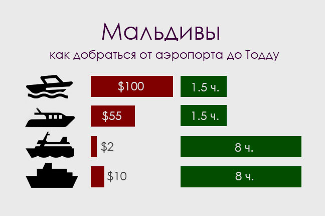 Я начал смотреть и читать про мальдивские бюджетные острова еще в прошлом году, когда мы собирались на очередную зимовку. В тот сезон мы в итоге уехали на Шри-Ланку, но общее представление у меня было. В целом, я выбирал из не очень большого количества вариантов — Маафуши, Расду, Тодду, и еще несколько в окрестностях. Дело в том, что на Мальдивах довольно дорогой трансфер. От аэропорта до острова вы можете добраться несколькими способами: государственным «фруктовым» паромом, рейсовым паромом, рейсовым катером, водным такси и воздушным такси — гидросамолетом.