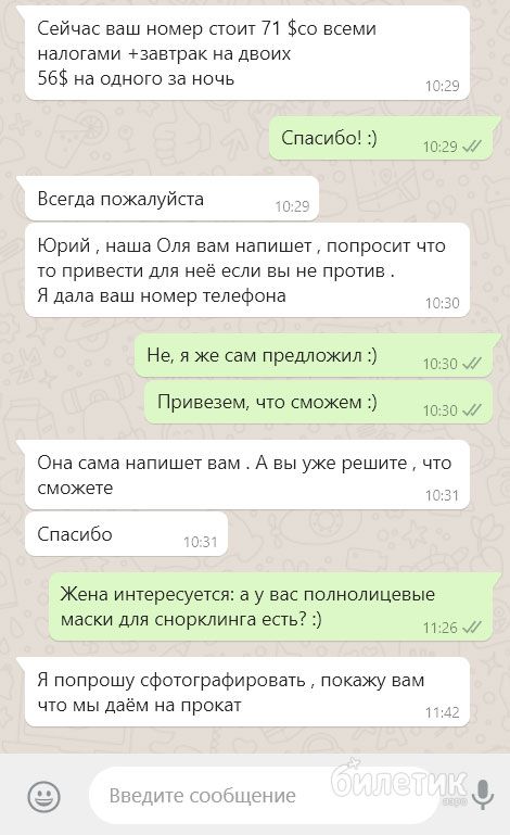 Посмотрел фотографии, почитал отзывы, и выбрал небольшой гестхауз Dive Villa чуть в стороне от нахоженных троп. Номер на двоих на две недели стоил у них 66 тысяч рублей с включенными завтраками. Забронировал. Данные кредитки с меня правда не потребовали, но подтверждение на почту прислали. Написал в отель, что вот мы, такие-то такие-то, прилетаем тогда-то, ждите нас. И тут мне ответила девушка. По-русски. В WhatsApp. И сходу предложила скидку, если я отменю бронирование букинга, а она мне просто выпишет ваучер на заселение в нужные даты.