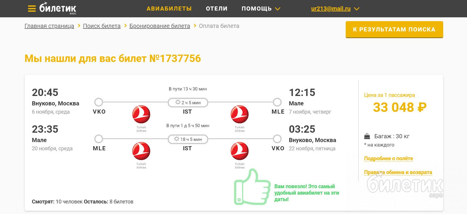 Первым делом я начал смотреть авиабилеты. В город Мале — столицу Мальдивской республики — из Москвы летает довольно много авиакомпаний. Самые недорогие билеты были у эмиратских и бахрейнских авиалиний, но когда я увидел значок Turkish Airlines, я неожиданно вспомнил, что давно хотел посмотреть Стамбул.В итоге нашел себе рейс, который на пути туда делает остановку в Стамбуле всего на пару часов, зато на пути обратно прилетает в Стамбул в шесть утра, а улетает из Стамбула в Москву почти в полночь. То есть мы с утра прилетим, весь день будем гулять по городу, а как стемнеет — поедем в аэропорт и спокойно улетим домой. Отличный вариант!
