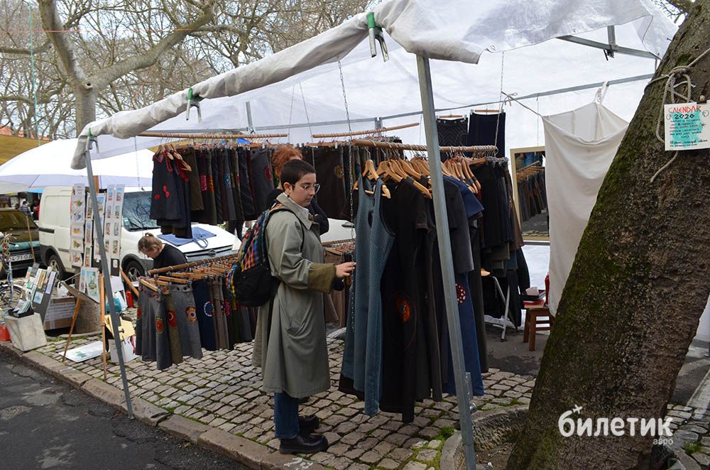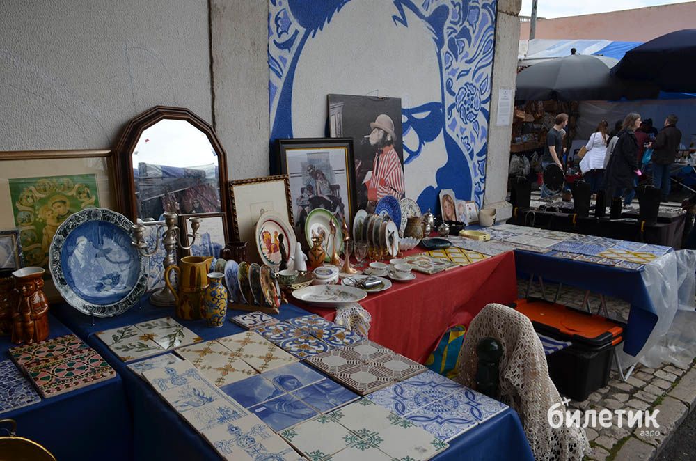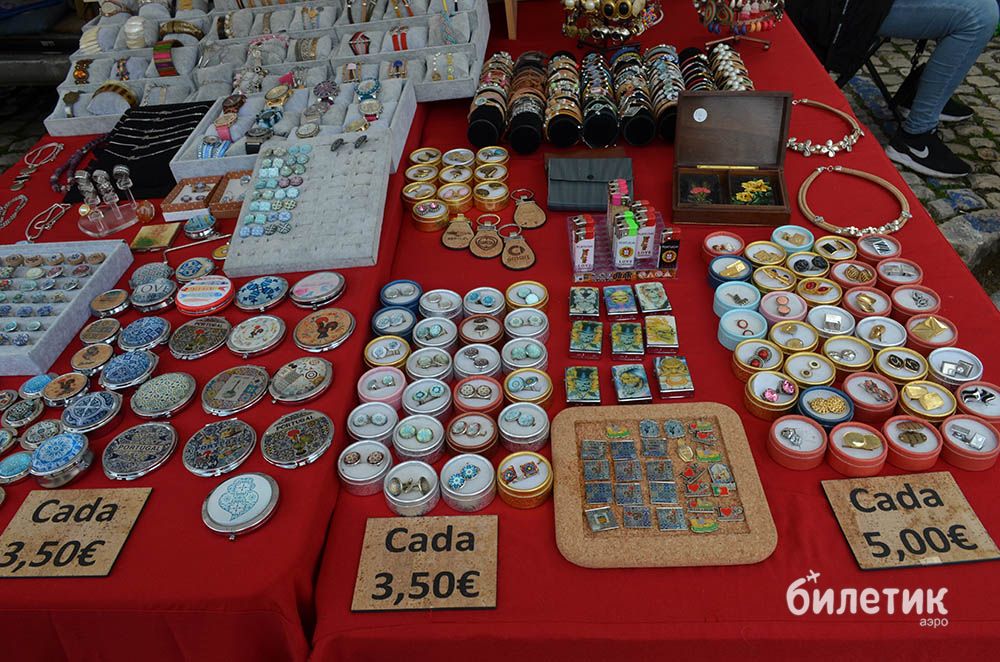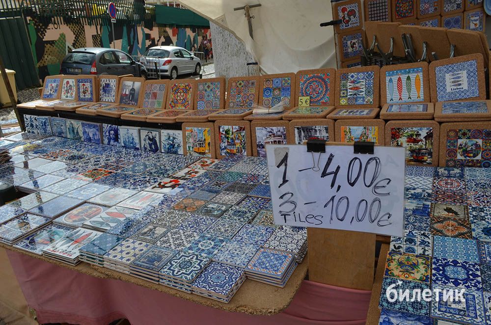 Ну и, конечно, не покупайте сувениры в городе, приходите за сувенирами сюда. Магниты, плакаты, пробковые сумочки и другие товары из пробки, открытки, керамика, даже автомобильные таблички — все, что связано с Португалией и Лиссабоном в частности, и все, что принято привозить из путешествия, можно купить здесь. Цены будут значительно ниже, чем в сувенирных магазинах в центре. При покупке от нескольких штук, цены еще снижают. И главное — здесь принято торговаться. Вы можете набрать памятных безделушек для всех своих родных, близких и коллег, не выходя за границы бюджета в 15-20 евро.