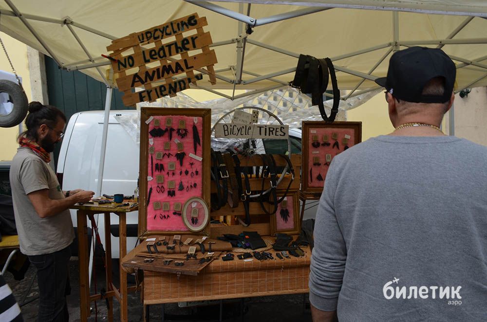 Мне встретилась лавка, в которой продавались изделия из велосипедных шин — ремни, портмоне, украшения. Хороший подарок для защитников природы и противников натуральной кожи.