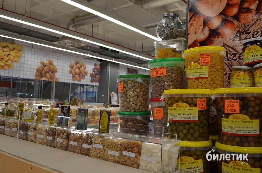 Знаменитые рыбные консервы, которые советуют привозить из Португалии все путеводители, здесь можно купить за 2-10 евро, против 8-20 евро в сувенирных лавках. Тут же можно купить вяленой океанской рыбки. Неплохим сувениром, который удобно перевозить, могут стать португальские орешки. Я взяла родным 4 пакетика со сладким миндалем в меде и миндальной крошке. По 100 грамм за 2 евро.