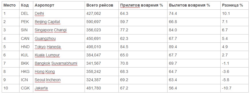 В Юго-Восточной Азии лучший аэропорт по влиянию на задержки — Дели, из 427 рейсов во время приземлилось 64,3% рейсов и 74,4% вылетело вовремя. Разница составила чуть более 10%. Худшим аэропортом стал — Джакарта, несмотря на сравнительно с Делли высокий % прилетов в 67,2% вовремя вылетело всего 56,4 % и разница составила минус 10,7%.