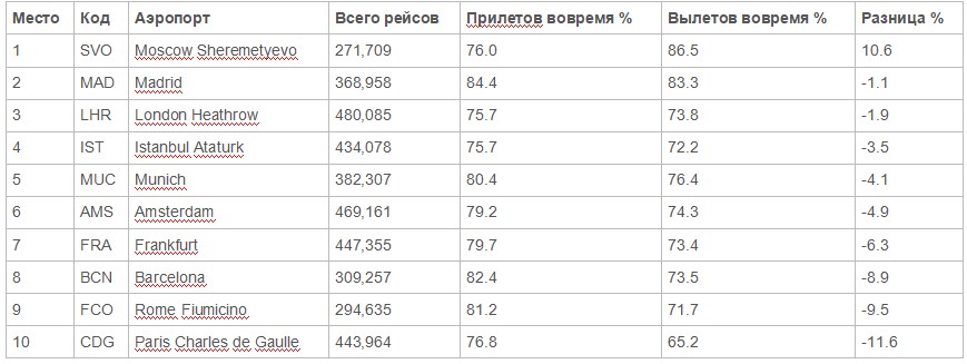 Официальный авиационный гид OAG опубликовал рейтинг мировых аэропортов по времени оборота воздушных судов по итогам 2017 года. Всего было проанализировано порядка 58 млн. рейсов в разных аэропортах и время их фактической отправки и прибытия. Суть анализа заключалось в том, усугубляется ли задержка рейса в самом аэропорту или же, наоборот, сокращается. Если вылетов с задержкой больше, чем прилетов — значит, аэропорт вносит свою лепту в этот процесс. Если же вылетов с задержкой меньше, чем прилетов — значит, в аэропорту хорошо реализованы процессы наземного обслуживания. Отличные показатели представил Российский аэропорт Шереметьево, он стал абсолютным лидером по времени оборота в Европе.