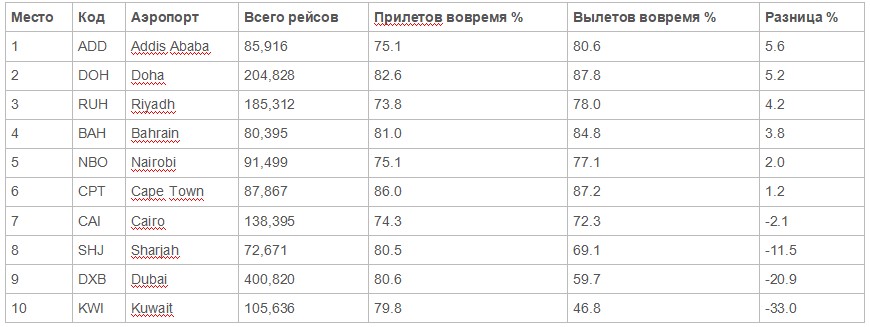 На Среднем Востоке и в Африке хороши аэропорты Аддис-Абеба и Доха, но Кувейт и Дубай показали худшие результаты не только даже и среди всех других регионов.