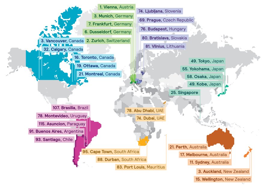 На первых местах по качеству жизни, как и в прошлом году, расположены города Новой Зеландии и Австралии. Окленд, Сидней, Веллингтон и Мельбурн остаются в топ-20 городов по уровню безопасности и качеству жизни в международном рейтинге.