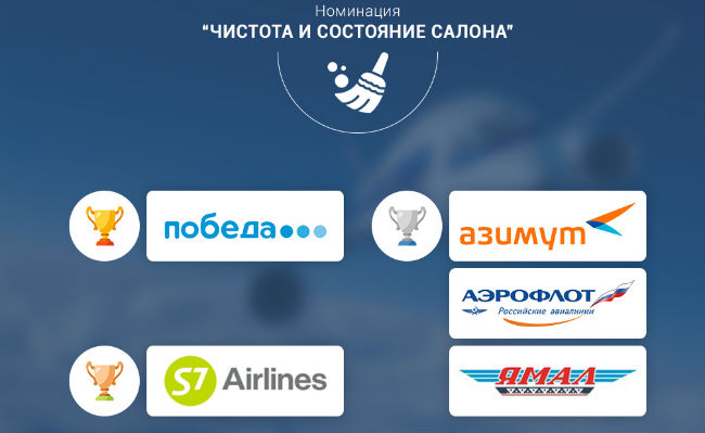 По результатам исследования самым чистым перевозчиком стала авиакомпания «Победа». Эксперты отметили, что персонал Победы отличается буквально маниакальным пристрастием к сбору мусора. Это и стало ключом лидерства в номинации «Чистота и состояние салона». За качество уборки воздушных судов перед вылетом и поддержанием чистоты во время полета поборолись авиакомпании «Азимут», «Аэрофлот»и «Ямал», занявшие второе место. Третьей, одной из чистой авиакомпанией, стала - S7 Airlines.
