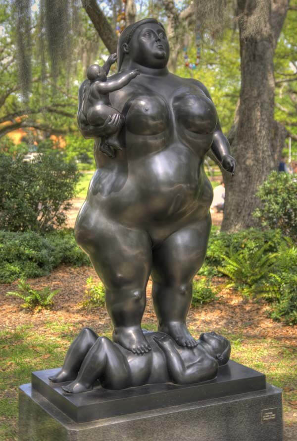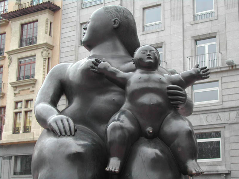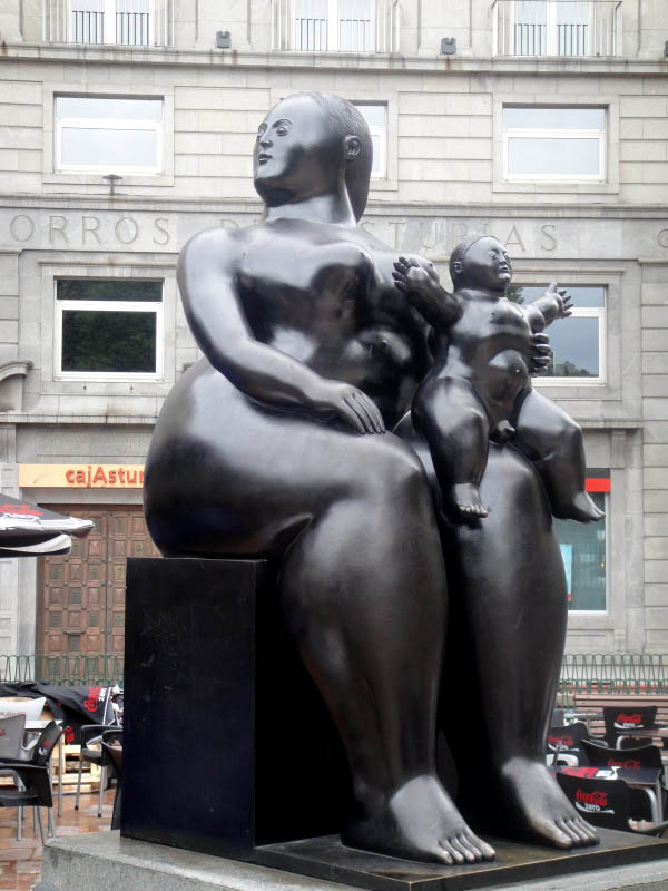 Эта скульптура называется La Meternidad («Материнство»). Она была создана колумбийским художником, скульптором Фернандо Ботеро и установлена в Овьедо в 1996 году. Создатель памятника не скрывает своего пристрастия к полным людям. Тучность, которую скульптор считает мерой красоты, находит отражение и в La Maternidad. Скульптура очень узнаваема. Как и в других произведениях Ботеро, в ней чётко прослеживается характерное для скульптора гротескное направление — фигуративизм.
