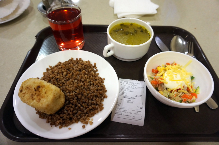 - Второй вариант: если встать спиной к аэропорту, справа увидите здание «Аэротеля», на втором этаже бюджетная столовая со «шведским столом»