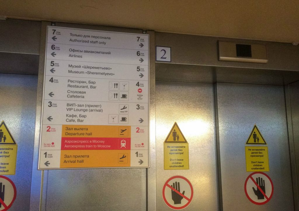 Напротив лифта — музей Шереметьево, вам следует спуститься по лестнице слева от лифта на 4 этаж. Далее повернуть налево — с одной стороны расположен ресторан с видом на взлетное поле, с другой — дешевая столовая.