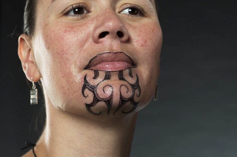 Татуироввки на подбородке были популярны у женщина племени Маори ˗ коренных жителей Новой Зеландии. Для людей племени татуировка означала обряд посвящения.Обычно её делали в подростковом возрасте. Узор на лице каждой женщины индивидуален: он считается проявлением её души и личности.