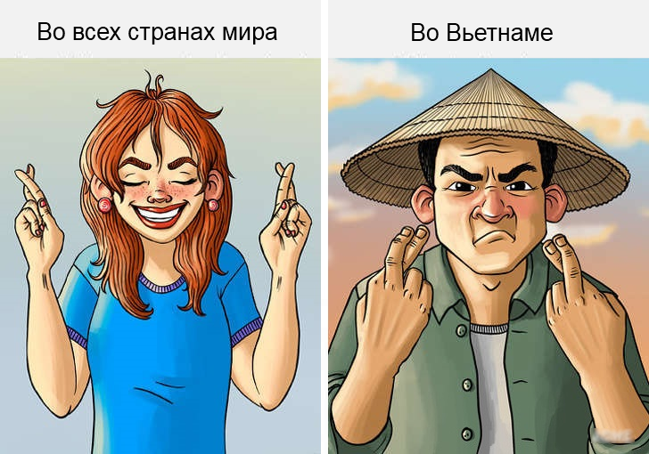 Жители многих стран для привлечения удачи скрещивают средний палец и указательный. Исключением является Вьетнам: здесь данный жест считается грубым намёком на женские половые органы и его используют как ругательство.