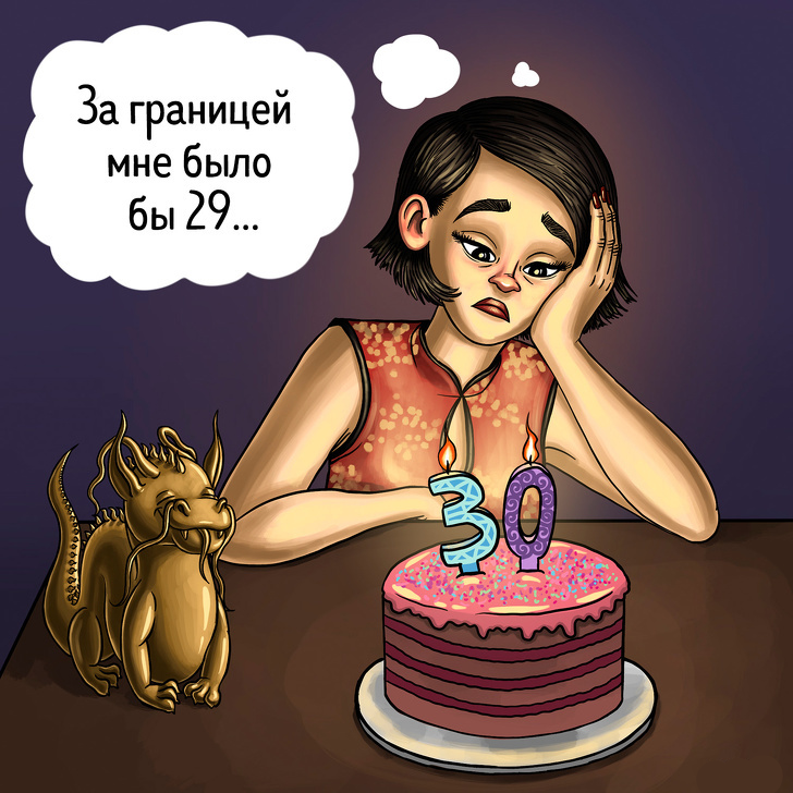 Когда в Китае рождается ребёнок, ему сразу же начисляется один год жизни. Возраст человека прибавляется не в день его рождения, а в Новый год, который празднуется по лунному календарю и каждый раз выпадает на разные даты. Из-за этого между фактическим возрастом человека и его возрастом по восточно-азиатскому исчислению образуется разница в 1-2 года.