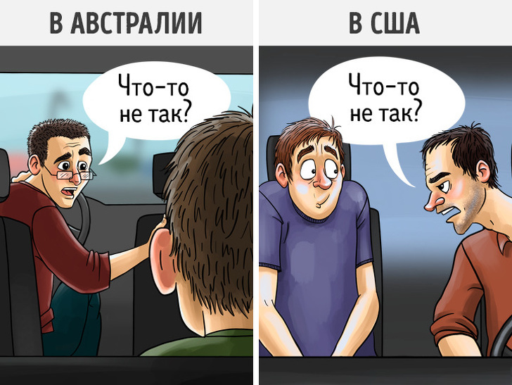 Если в США вы сядете в такси на переднее сидение, то водитель воспримет это как вторжение в его личное пространство или решит, что вы хотите его ограбить. В Ирландии, Нидерландах, Новой Зеландии, Шотландии, Австралии иные традиции: здесь водитель сочтёт за грубость, если пассажир сядет не рядом с ним, а на заднее сиденье.