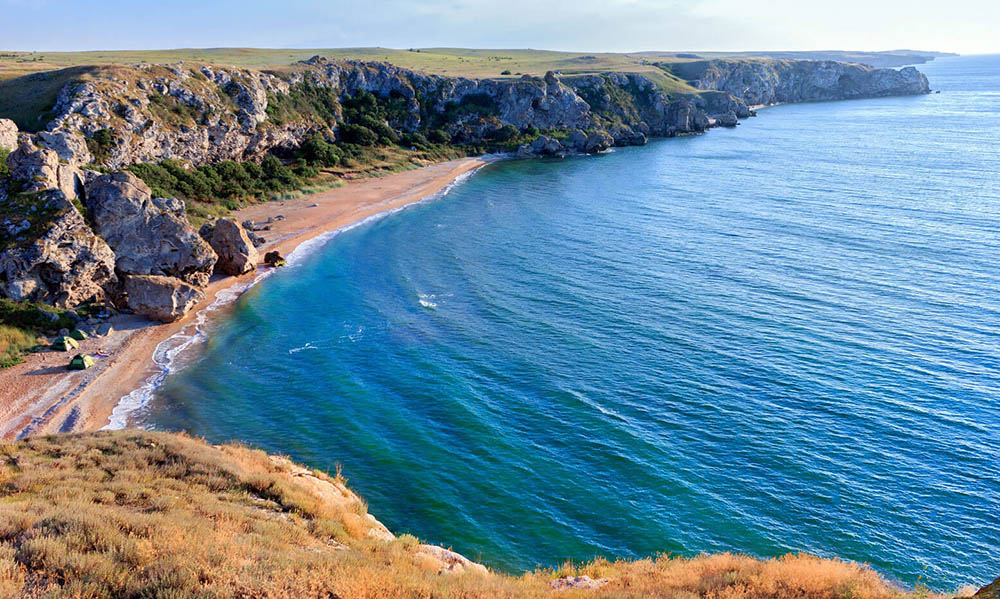 Лучшие места в Крыму для отдыха с детьми и палатками — дикие, живописные пляжи невероятной красоты на побережье Азовского моря. За необычный ландшафт и множество укромных заливов эти красивые места в Крыму прозвали краем тысячи бухт и русским Таиландом. Генеральские пляжи — километры рыже-изумрудной крымской степи на бирюзовом фоне Азовского моря и футуристические пейзажи (каменные гроты, столбы и арки). Около полувека назад на территории Каларского ландшафтного парка проводились секретные испытания ядерного и водородного оружия. Так Генеральские пляжи получили своё название: в память о генерал-лейтенанте инженерных войск, наблюдавшем за полигоном с безопасного расстояния у моря.